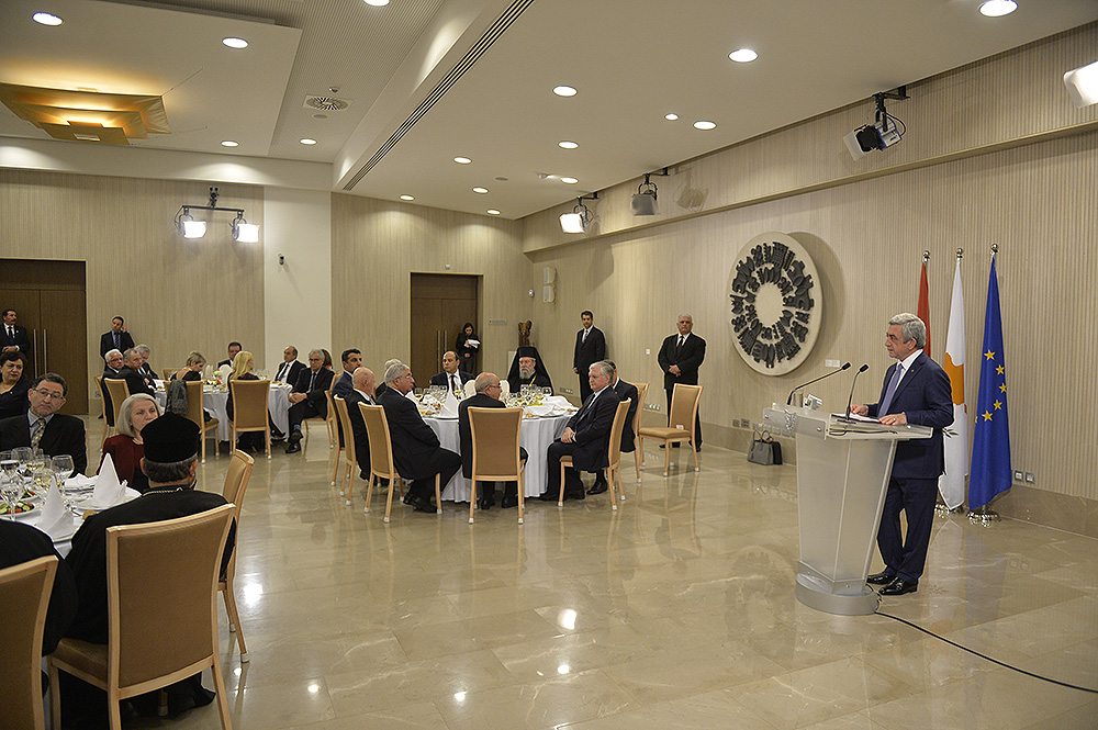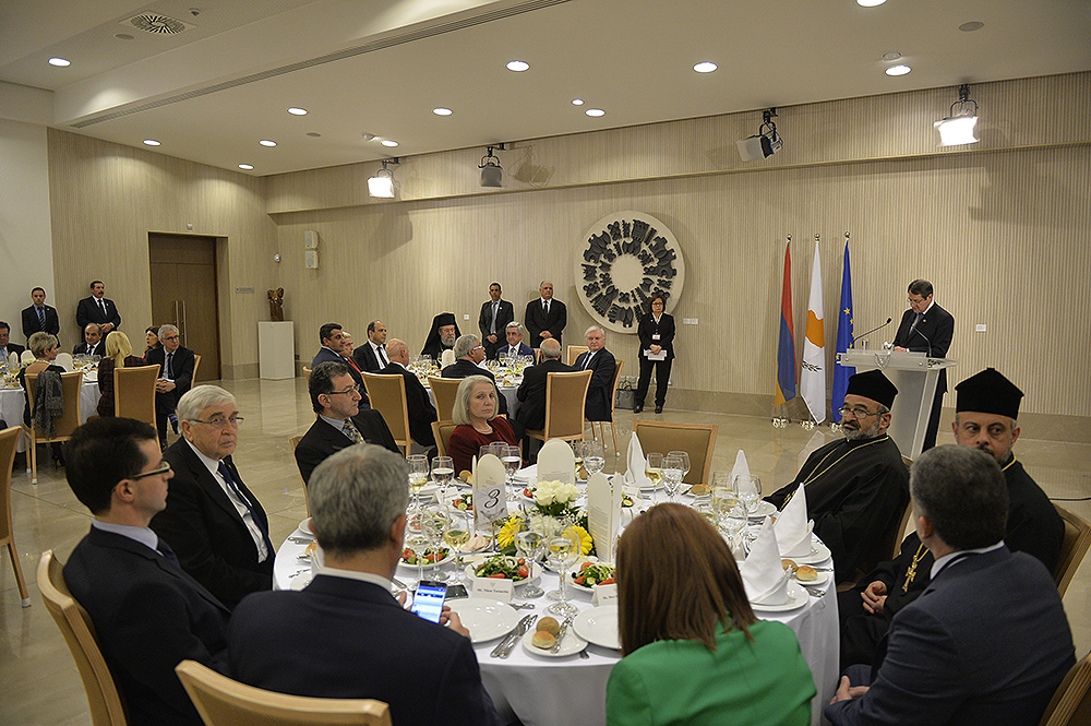 Կիպրոսի Նախագահը ևս իր բաժակաճառում խոսել է երկու ժողովուրդների բազմադարյա բարեկամության և այդ բարեկամությունն առավել ամուր դարձնող Կիպրոսի հայ համայնքի մասին, որի տաղանդաշատ ներկայացուցիչները, Նախագահ Անաստասիադիսի խոսքով, հարյուր տարի առաջ մազապուրծ լինելով օսմանյան կայսրության կողմից իրականացված ցեղասպանությունից և հաստատվելով Կիպրոսում, տարիներ ի վեր իրենց աշխատասիրությամբ, ստեղծագործ ուժով մեծ նպաստ են բերում Կիպրոսի տնտեսության և այլ ոլորտների զարգացմանը` լինելով գիտնականներ, գործարարներ և ամենատարբեր բնագավառների որակյալ մասնագետներ: