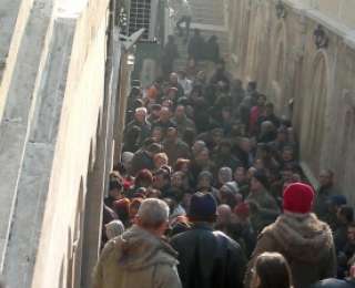 Նկարին մէջ երեւցողները խեղճ հալէպհայեր են, որոնք առաւօտ կանուխէն հաւաքուած են Սուրբ Աստուածածին եկեղեցւոյ սրահին մուտքին՝ ստանալու 4.000 սուրիական լիրա, որ կը հաւասարի 40 տոլարի օգնութիւն, որոնցմէ մեծամասնութիւնը տուն դարձած է ոչինչ ստանալով: