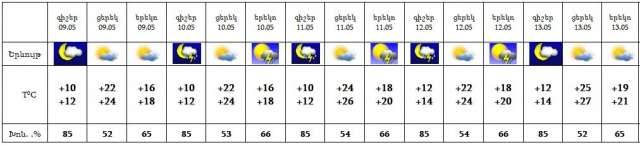 Մայիսի 9-ին, 13-ին երեկոյան ժամերին հնարավոր է ամպրոպ, անձրևի հավանականությունը փոքր է: Մայիսի 10-12-ին առավելապես օրվա երկրորդ կեսին և գիշերվա առաջին կեսին սպասվում է կարճատև անձրև և ամպրոպ, ամպրոպի ժամանակ‵ քամու ուժգնացում‵ 15-17մ/վրկ: