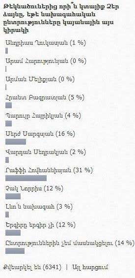 Կցանկանայի անդրադառնալ BlogNews նախագահական ընտրությունների հարցմանը: Ես կարծում եմ ու համոզված եմ՝ այստեղի քվեարկությունը կարելի է համարել ամենաօբյեկտիվը: Շատերը կկարծեն՝ չի կարելի լուրջ վերաբերվել այպիսի հարցմանը, իսկ ինչո՞ւ լուրջ չվերաբերվենք`108000 մասնակից, որից շուրջ 6000 քվեարկող, որոնք ներկայացնում են տարբեր խավեր, տարբեր տարիքային խմբեր, իսկ այն քվեարկողները, ում տարիքը 18-ից ցածր է, համոզված եմ, որ մեծ մասը կքվեարկեն իրենց ծնողների կարծիքին համապատասխան: Իսկ ինչ վերաբերում ա ոչ մեկին չքվեարկող ձայներին, որոնք տեղ են գտել հարցման արդյունքում`շուրջ 45 տոկոսը, կավելացնեմ, որ այդ մարդկանց ձայների մեծ մասը օր օրի նկատվում է, փոխվում են հօգուտ Րաֆֆի Հովհաննիսյանին: Այս պարագայում ես չեմ կարող ասել՝ ժողովուրդը անխզելիորեն հավատում է պարոն Հովհաննիսյանին, պարզապես մեծամասնությունը ցանկանում է՝ Սերժ Ազատի Սարգսյանը չդառնա երկրի նախագահ, նա այստեղ հավաքել է ընդամենը 16 տոկոս ձայն: Ու այսօրվա իշխանությունը համոզված կլինի, որ ընտրությունները առանց կեղծելու, առանց խնդրի առաջին փուլում հաղթանակ կտոնի պարոն Սարգսյանը, ծիծաղելի է պարզապես:
