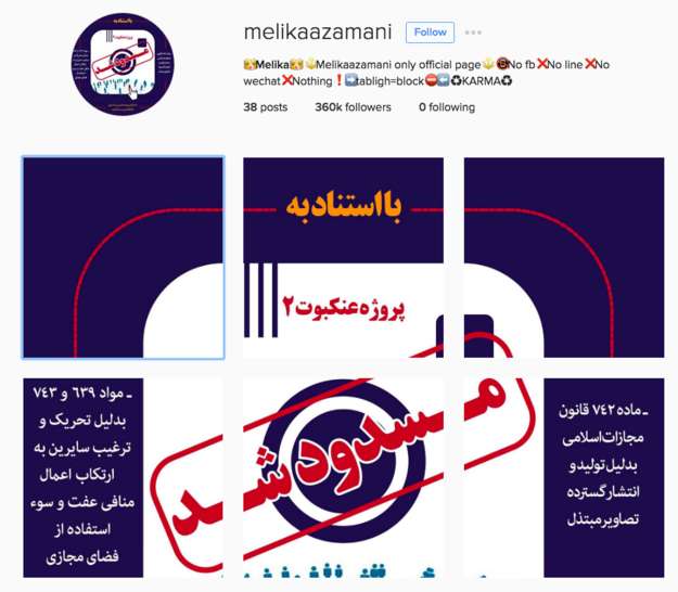 Մելիկա Զամանին ևս պատժվել է իր ինստագրամյան էջում հրապարակված չափազանց զուսպ, բայց գեղեցիկ լուսանկարների համար, որտեղ նա առանց հիջաբի է: Մոդելի մասնակցությամբ դատական գործը ընթացքի մեջ է, իսկ նրա էջը սոց կայքում, որն ի դեպ 360 000 հետևորդ ունի, ահա այս տեսքն ունի: