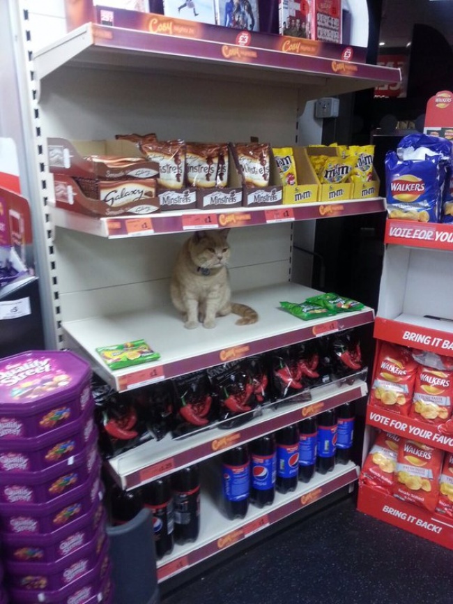 Ինչպես նշում է AdMe.Ru-ն, ասվածի վառ ապացույցն է ստորև ներկայացված ֆոտոպատմությունը, որի հերոսն արդեն տևական ժամանակ է, ինչ հրաժարվում է հեռանալ լոնդոնյան Sainsbury սուպերմարկետից: Կատվին առանձնահատուկ կերպով դուր են եկել խանութի դարակները, որոնց վրա դրվում են վաճառվող տարատեսակ ապրանքներ: