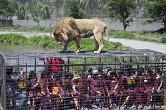 Առյուծների ուշադրությունը միայն թարմ միսն է կարողանում շեղել, որն էլ այցելուները բերում են իրենց հետ։ Զգալով գայթակղիչ հոտը՝ գիշատիչներն առանց վարանելու ցատկում են ավտոբուս-վանդակների վրա, քայլում են դրանց վրայով և ուշադիր նայում մարդկանց։