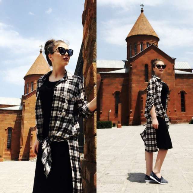 Եկեղեցու ֆոնին արված լուսանկարներում դերասանուհին կրում է սև զգեստ, որի վրայից հագել է վանդակավոր ոճային «վերնաշապիկ»: Նրա կերպարին թեթևություն են հաղորդում հարմարավետ մարզակոշիկները: