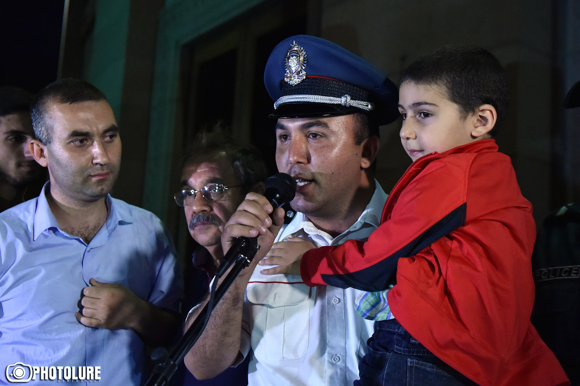 Ազատության հրապարակում ընթացող հանրահավաքին ոստիկաններից մեկ մոտեցավ հարթակին՝ ցանկություն հայտնելով սեղմել ոստիկաններից վախեցած երեխայի ձեռքը, ում հայրը կոչ էր արել ոստիկաններին մոտենալ իր երեխային, սակայն ոչ մի ոստիկան չէր մոտեցել: