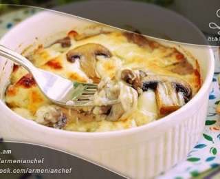 - Պատրաստի ուտեստը լցնում ենք ձևամանների մեջ, վրան ավելացնում ենք սոուսի մնացած կեսը և վրան դնում երկար շերտերով կտրատված պանիրն ու տապակած շամպինիոնի կտորները: