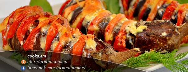 - Սմբուկի յուրաքանչյուր կտրվածքի մեջ անպայման բուսայուղ ենք քսում (որպեսզի խորովելիս շատ չչորանա) և հերթով շարում լոլիկն ու գազարը: