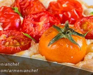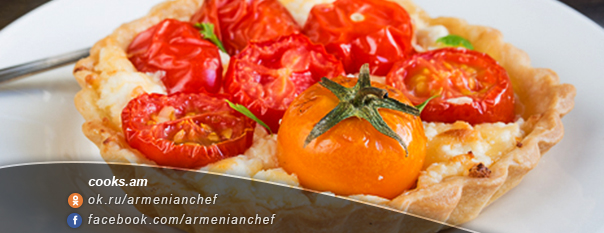 - Պանիրը լցնում ենք թխված հիմքերի մեջ, լցնում սերուցքն ու շարում լոլիկները (եթե խոշոր են՝ մի քանի կտոր ենք անում):