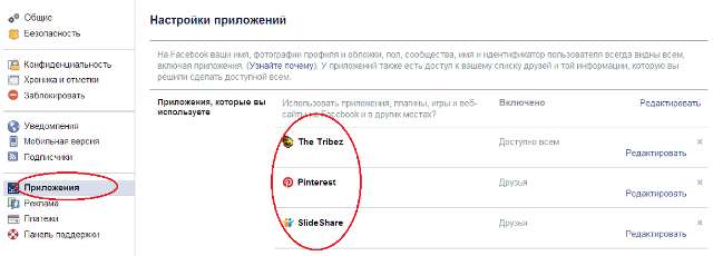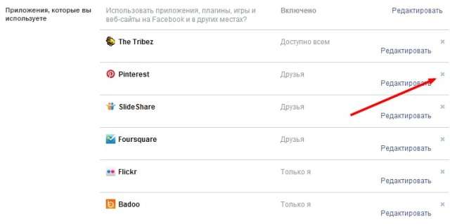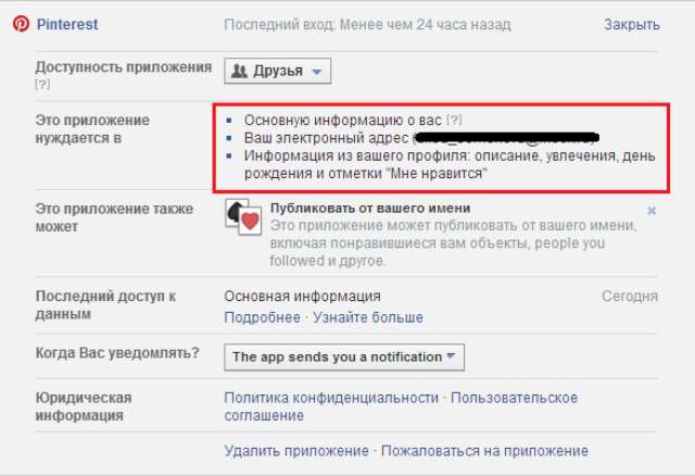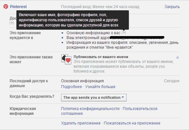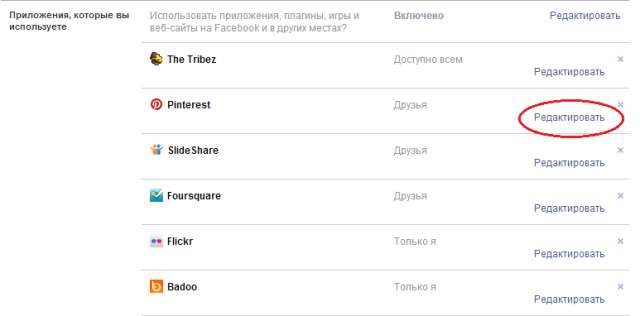 3. Եթե ցանկանում եք իմանալ, թե ինչ գիտեն այս հավելվածները մասին, սեղմեք «edit» («Редактировать», «Փոխել»)։ Օրինակ՝ Pinterest-ը մուտք ունի ձեր մասին հիմնական ինֆորմացիային՝ էլեկտրոնային փոստ, ծննդյան թիվ, հետաքրքրություններ, «Ինձ դուր է գալիս» հատվածին։