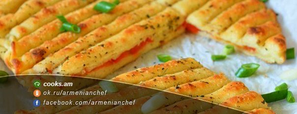 - Խմորը 8 հավասար մասի ենք բաժանում (ստացվելու է 4 մեծ բլիթ): Մի կտորը վերցնում ենք և կլոր գրտնակում: Վրան քսում ենք թրմված յուղը, շարում ենք լոլիկների կտորները և սխտոր ցանում:
