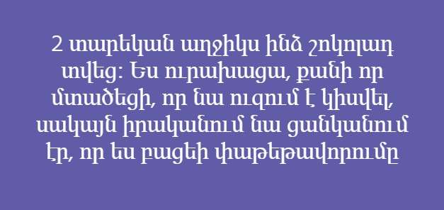 Ծնող լինելը չափազանց բարդ է, քանի որ միայն երեխաներն են կարողանում ընդամենը մի քանի վայրկյանների ընթացքում խառնել ամբողջ տունը և հիստերիայի հասցնել մեծահասակներին։ BlogNews-ը գտել է ծնողների 8 խոստովանություններ, որոնք հատկանշական են բոլոր երեխաների համար։