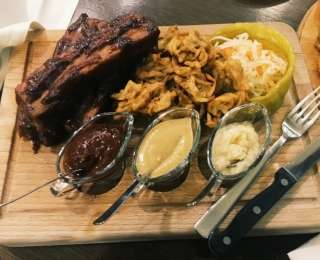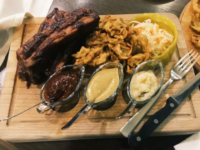 Մինչև կհալածվեր վերջին սոխի օղակը, բերեցին հիմնական ուտեստը:) Խոզի կողեր, բայց հաստ մսով. ամենայն հավանականությամբ rib eye-ը ամենահամեղ մասերից մեկն է: