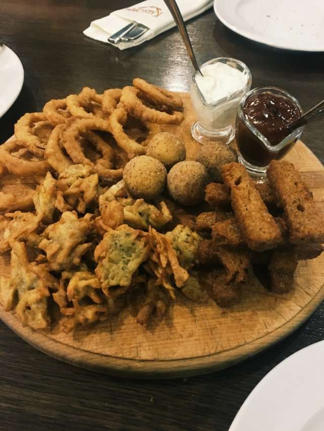 Բերեցին նախուտեստը, մինչև կպատրաստվեր հիմնականը: Սոխի օղակներ, նրբագույն պանրի գնդիկներ, բրամբորակ (քերած կարոտոֆիլից ու համեմված) և սխտորով գրենկի: