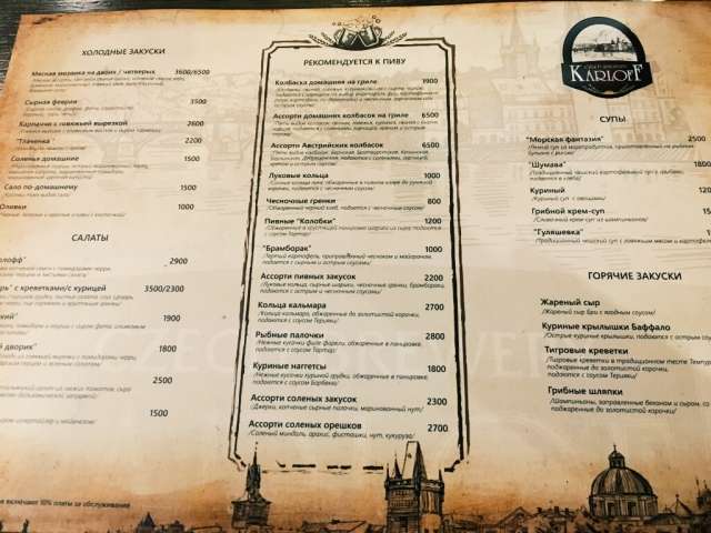 Ինչո՞ւ Karloff-ից, որովհետև իր կատեգորիայի մեջ ամենահայտնիներից է, մասնագիտացած չեխական խոհանոց: Խոհարարը հրավիրված էր Չեխիայից: Գարեջուր եփողը նույնպես հրավիրված էր Չեխիայից: