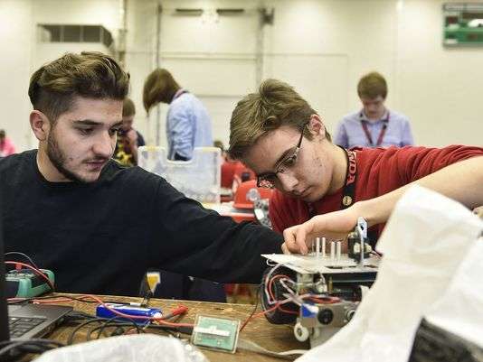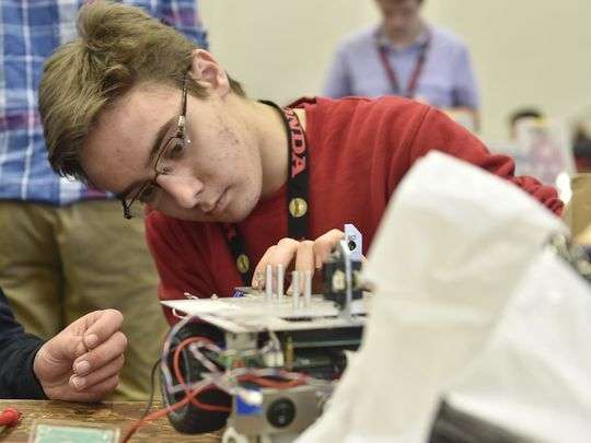 Այբ ավագ դպրոցի աշակերտ Արեգ Կարապետյանը՝ ռոբոտի վրա աշխատելիս։ Լուսանկարը՝