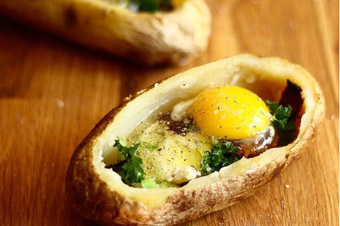 Բեկոնը տապակել և մանր կտրատել: Կանաչ սոխը ևս մանր կտրատեք: Տաքացրեք ջեռոցը 175˚: Կարտոֆիլը բաժանեք երկու մասերի: Գդալով զգուշորեն քերեք միջուկը: Դրեք կարտոֆիլները թավայի մեջ: Յուրաքանչյուր «նավակի» մեջ լցրեք 1 ճաշի գդալ կարագի ½ մասը: Յուրաքանչյուրի մեջ ավելացրեք նաև 1 ճ. գդալ պանիր: Բեկոնն ու կանաչին հավասարաչափ լցրեք կարտոֆիլների մեջ: Վերևում կոտրեք ձու: Աղ և պղպեղ ցանեք: