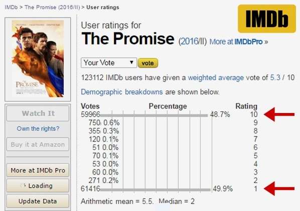 Ֆիլմի պաշտոնական պրեմիերայից երկու օր առաջ IMDb-ում 123.112 գնահատում էր արվել, ինչը քանակով ավելի շատ է, քան, օրինակ, «Կենդանիների գաղտնի կյանքը» կոչվող ֆիլմինը, որը 2016 թվականի բավականին հայտնի էր: Ընդհանուր առմամբ՝ 61.446 օգտատեր 1 աստղով էր գնահատել «Խոստումը», իսկ 59,966 օգտատեր՝ 10 աստղով: Նախկինում ֆիլմը միայն երեք անգամ էր ցուցադրվել՝ 2016-ի սեպտեմբերին, Տորոնտոյի ֆիլմերի միջազգային փառատոնի ընթացքում: Այնուամենայնիվ, ընդամենը երեք ցուցադրությունից հետո հազարավոր կեղծ օգտատերերի կողմից փորձեր էին արվում իջեցնել ֆիլմի վարկանիշը. այդպես առցանց ճակատամարտ սկսվեց հայերի ու ժխտող թուրքերի միջև: