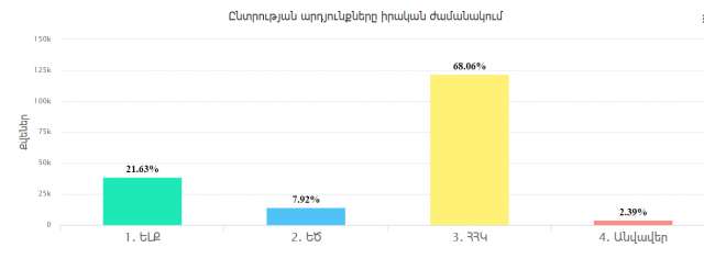 Ըստ «Ելք» դաշինքի օնլայն ռեսրուրսի՝ Real-elections.am կայքի՝ նախնական արդյունքներով, ձայների 68,06%-ով հաղթում է ՀՀԿ-ն: Երկրոդ տեղում «Ելք» դաշինքն է՝ 21,63%-ով: