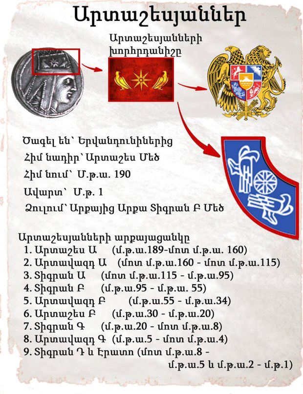 Արտաշեսյանների, Արշակունիների, Բագրատունիների և Ռուբինյանների (Կիլիկյան թագավորություն) զինանշանները։ Դրանք բոլորում են բիբլիական Արարատ լեռան պատկերը, որի գագաթին ուրվագծվում է Նոյյան տապանը։
