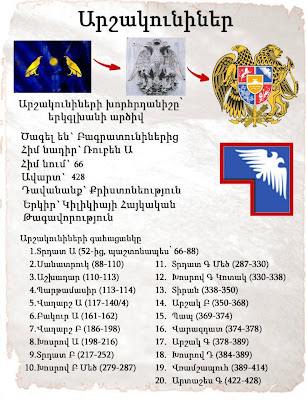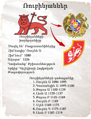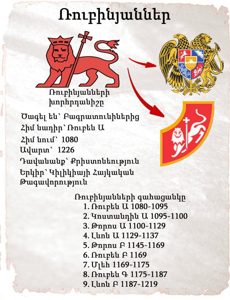 Արտաշեսյանների, Արշակունիների, Բագրատունիների և Ռուբինյանների (Կիլիկյան թագավորություն) զինանշանները։ Դրանք բոլորում են բիբլիական Արարատ լեռան պատկերը, որի գագաթին ուրվագծվում է Նոյյան տապանը։