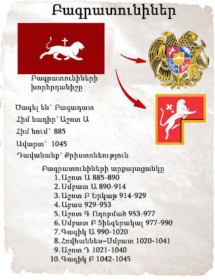 Հայաստանի Հանրապետության զինանշանի կենտրոնական մասում` վահանի վրա, պատկերված են հայկական չորս թագավորական տոհմերի`