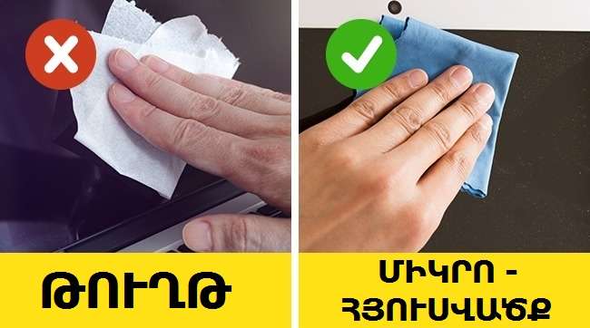 Փոշին մոնիտորից մաքրելու համար մարդիկ շատ հաճախ օգտագործում են սովորական չոր անձեռոցիկներ, սակայն դրանք չեն կարողանում հավաքել փոշին և փոքրիկ խազեր են թողնում մոնիտորի մակերևույթին։ Այդ անձեռոցիկների փոխարեն պետք է օգտագործել միկրոհյուսվածքից պատրաստված կտոր։