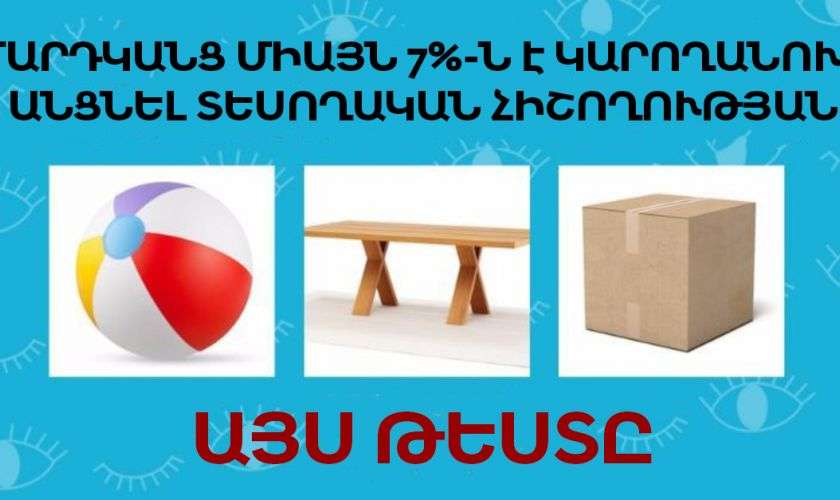 Անցեք թեստը, պարզեք՝ արդյոք պատկանում եք մարդկանց այդ 7%-ին: Կայքում տեղ գտած մտքերն ու տեսակետները հեղինակի սեփականությունն են և կարող են չհամընկնել BlogNews.am-ի խմբագրության տեսակետների հետ: print Տպել