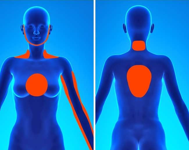 - Ցավը առաջանում է կրծքավանդակի կենտրոնում, և կարող է տարածվել ձախ ձեռի և ողնաշարի շրջանում։