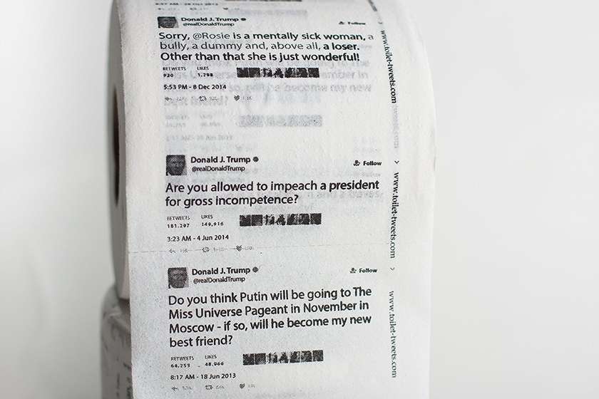 ԱՄՆ նախագահ Դոնալդ Թրամփի թվիթերյան գրառումներով զուգարանի թուղթ է վաճառքի դրվել Amazon առցանց վաճառքի կայքում, հաղորդում են ամերիկյան լրատվամիջոցները:
