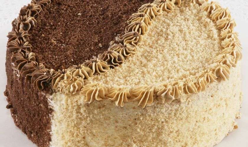 9. Երբ ամեն ինչ պատրաստ է, սկսել հավաքել տորթը: Ներքևի շերտը «գիշերն» է: Վրան կրեմ քսել, մի փոքր սպասել, որպեսզի ներծծվի և չծորա կողքերով: Հետո վրան դնել «ցերեկը»: Վրան կրեմ քսել: