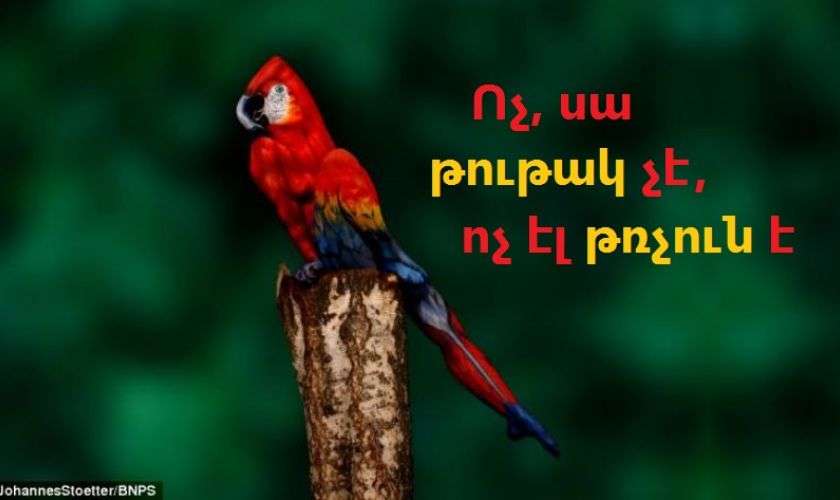 Առաջին հայացքից բոլորին էլ թվում է, թե լուսանկարում գույնզգույն թութակ է պատկերված, որը նստած է կոճղի վրա։ Բայց եթե առավել մոտիկից մանրակրկիտ նայեք, ապա կտեսնեք, որ այն թութակ չէ, այլ՝ կին։