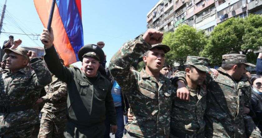 Քիչ առաջ Երևանի տարբեր փողոցներում իրականացվող բողոքի ցույցերից մեկին միացան շուրջ երկու տասնյակ զինվորական հագուստով մարդիկ։
