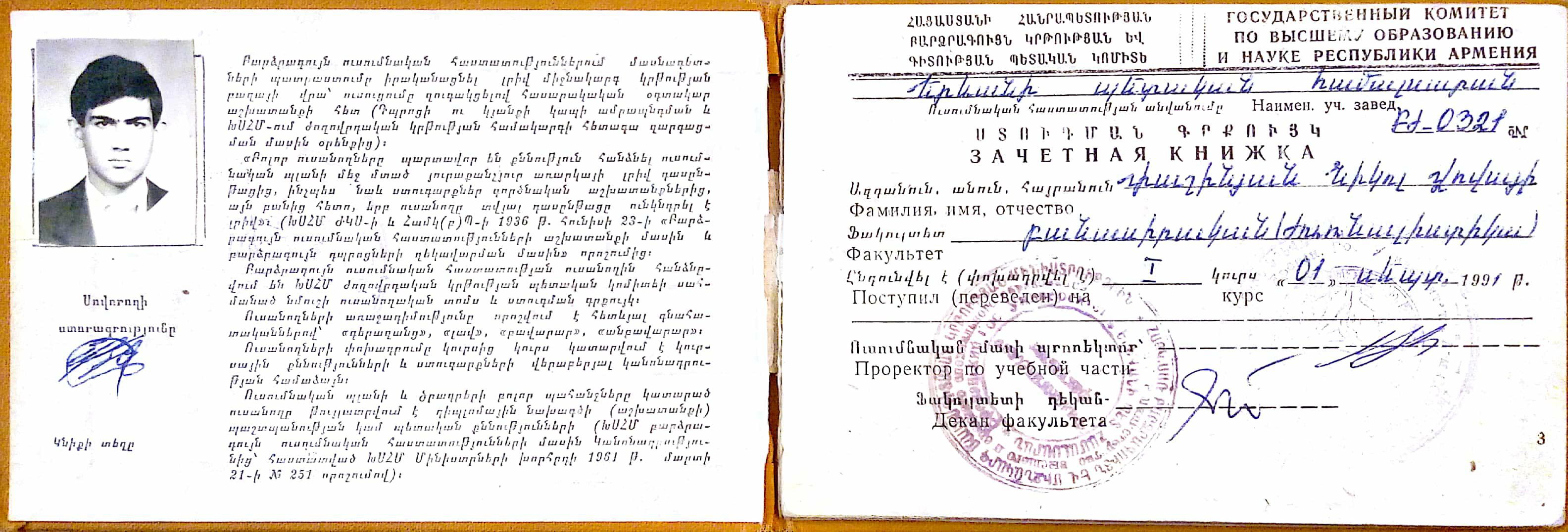 1991 թվականին ընդունվել եմ Երևանի պետական համալսարան, իսկ 1995 թվականին, հինգերորդ կուրսում, ավարտական քննությունները սկսելուց մեկ կամ երկու օր առաջ ռեկտորատի որոշմամբ հեռացվել համալսարանից։ Որոշումը ունեցել է քաղաքական պատճառներ և կապված է եղել իմ լրագրողական գործունեության, մամուլում իմ հեղինակած մի շարք հոդվածների հետ։ Ինձ առաջարկվել է զղջումնագիր-դիմում գրել և տեղում կվերականգնվեմ, բայց, բնականաբար, մերժել եմ այդ առաջարկը։