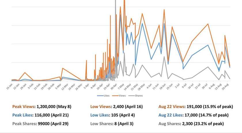 Օգոստոսի 22-ի դրությամբ ժողովրդի թեկնածուի դիտումներն իջել են մինչև 191 000 (15,9% of peak), լայքերը նվազել են մինչև 17 000 (14.7% of peak), կիսումներն իջել են մինչև 2300 (23.2% of peak)։