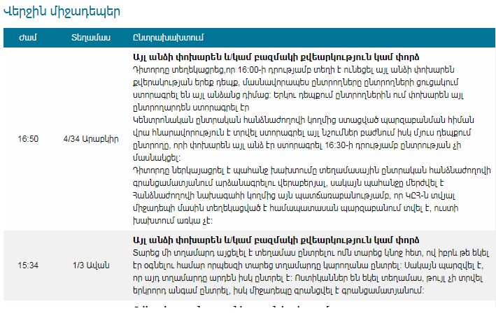 Արաբկիրի 4/34 տեղամասում դիտորդը տեղեկացրել է, որ 16:00-ի դրությամբ տեղի է ունեցել այլ անձի փոխարեն քվեարկության երեք դեպք, մասնավորապես ընտրողներն ընտրացուցակում ստորագրել են այլ անձանց դիմաց: Երկու դեպքում ընտրողներին, ում փոխարեն այլ ընտրող արդեն ստորագրել էր, Կենտրոնական ընտրական հանձնաժողովի կողմից ստացված պարզաբանման հիման վրա հնարավորություն է տրվել ստորագրել այլ նշումներ բաժնում, իսկ մյուս դեպքում ընտրողը, որի փոխարեն այլ անձ էր ստորագրել,16:30-ի դրությամբ ընտրության չի մասնակցել: