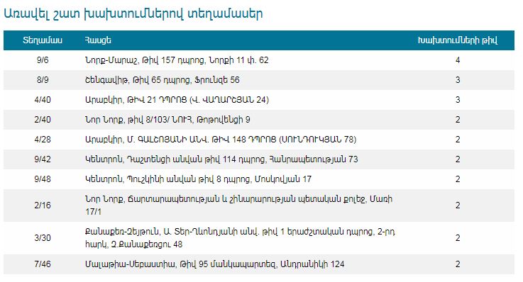 Ամենից շատ խախտումներով տեղամասերն են Նորք Մարաշ վարչական շրջանի 9/6 տեղամասը, Շենգավիթ վարչական շրջանի 8/9 տեղամասը և Արաբկիրի 4/40 ընտրատեղամասը: Այս տեղամասերում գրանցվել է համապատասխանաբար 4, 3, 3 խախտում: