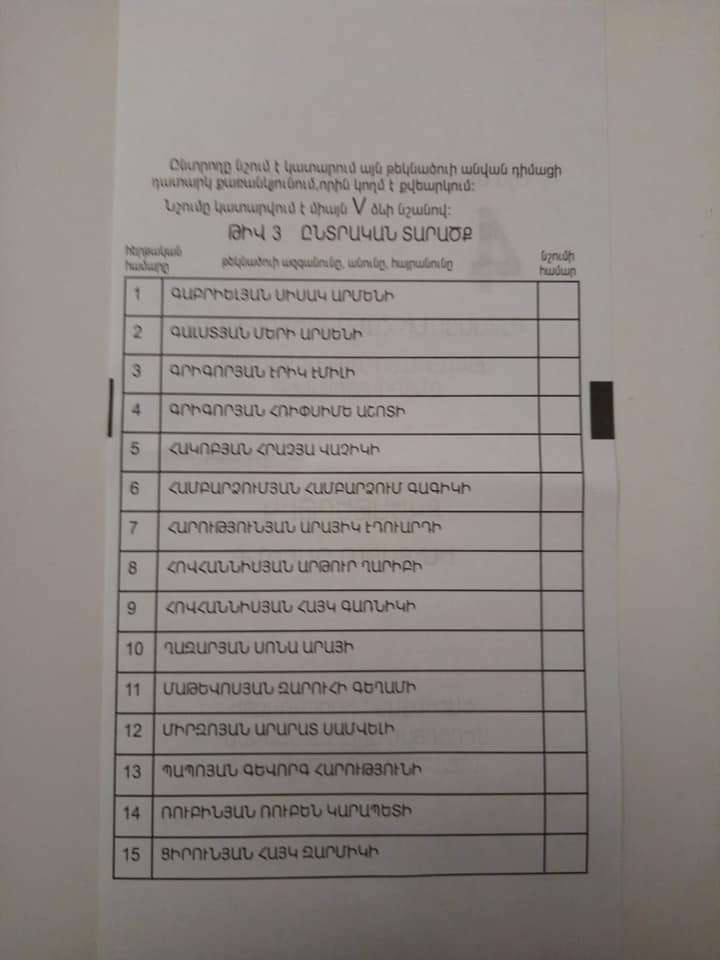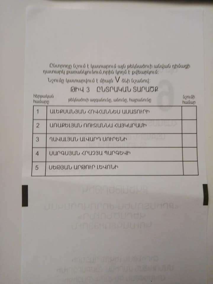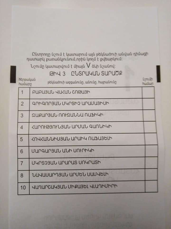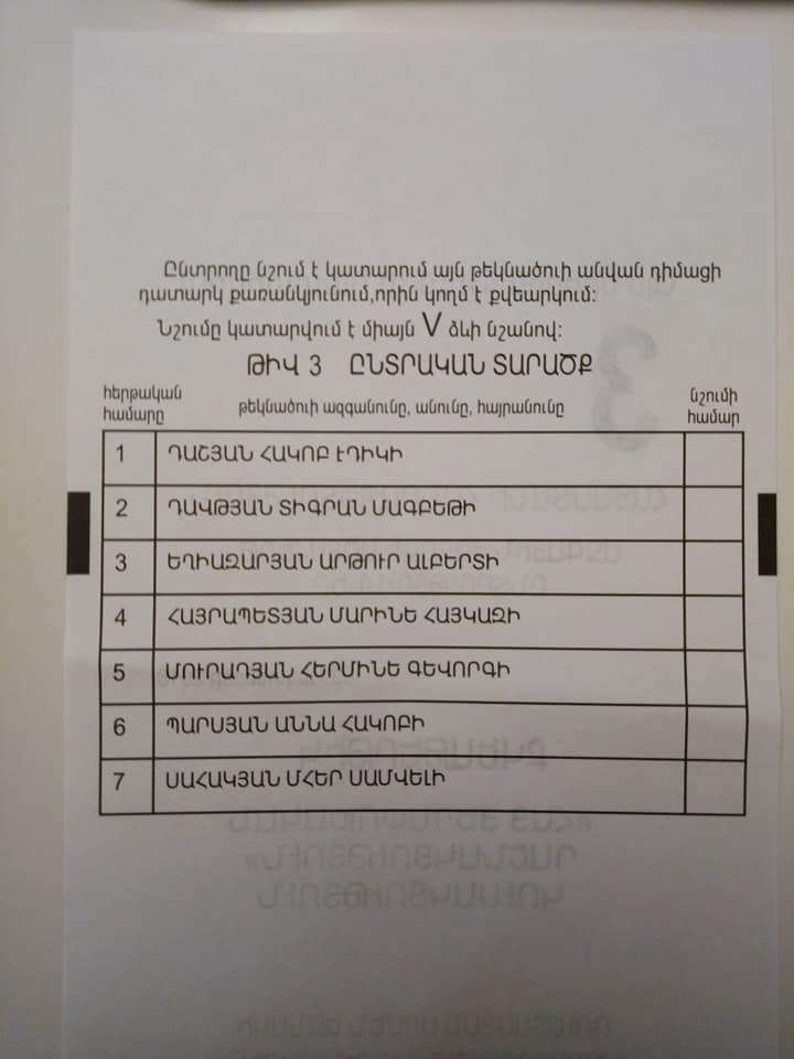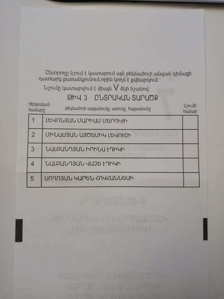 Հայտնում եմ, որ 3-րդ ընտրատարածքում հայտնաբերել եմ հետևյալ ԽՆԴԻՐԸ՝ առկա է անհամապատասխանություն ԿԸՀ-ի կողմից հրապարակած ցուցակներում ռեյտինգային թեկնածուների հերթական համարների և քվեաթերթիկներում նույն թեկնածուների հերթական համարների միջև՝ բացառությամբ ՀՀԿ-ի և ԲՀԿ-ի, որոնց դեպքում ցուցակում և քվեաթերթիկում թեկնածուների հերթականությունը ճիշտ է: