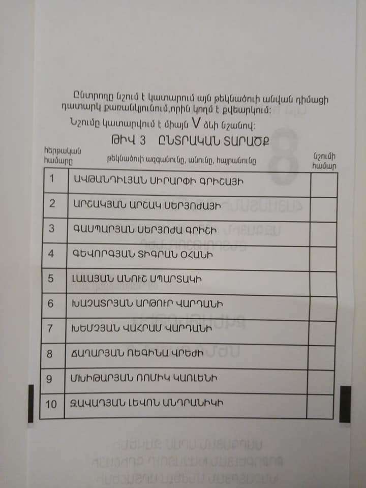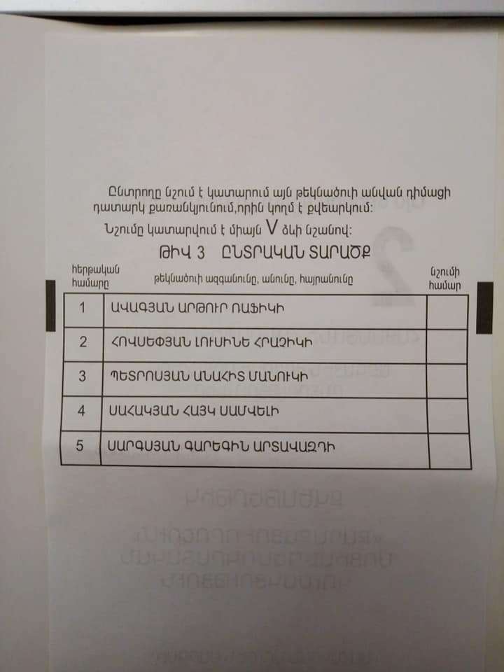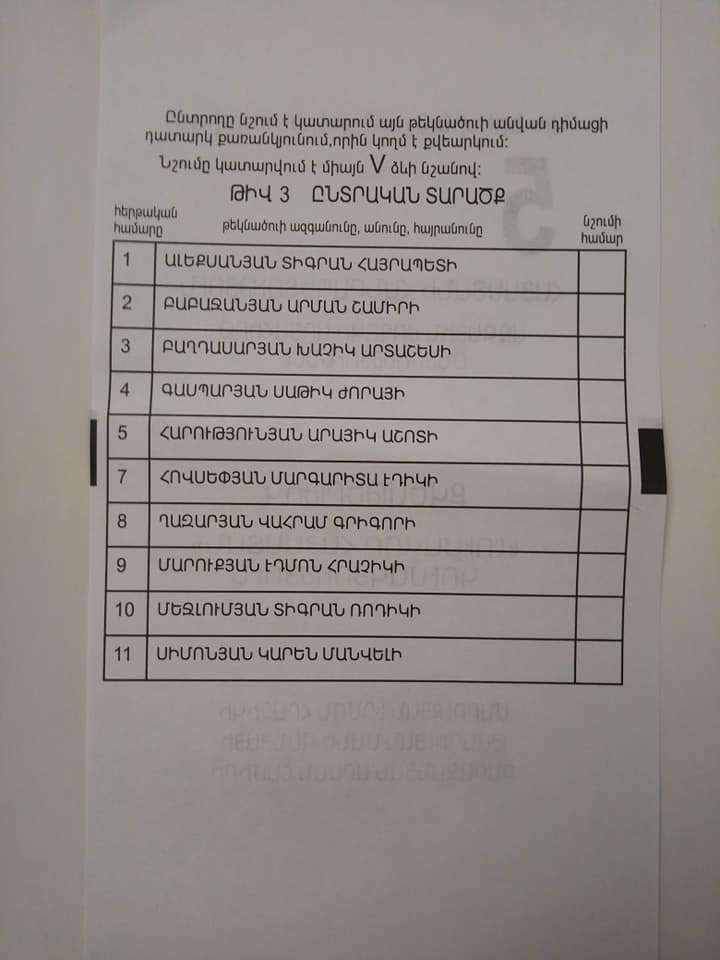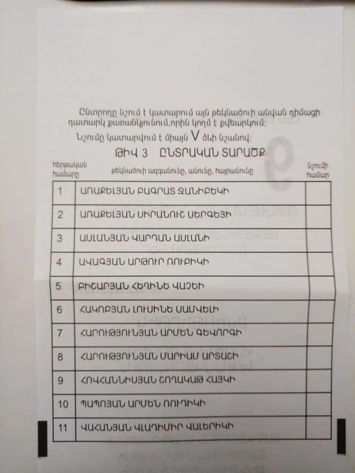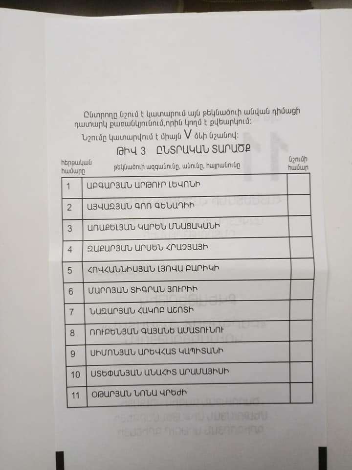 Հայտնում եմ, որ 3-րդ ընտրատարածքում հայտնաբերել եմ հետևյալ ԽՆԴԻՐԸ՝ առկա է անհամապատասխանություն ԿԸՀ-ի կողմից հրապարակած ցուցակներում ռեյտինգային թեկնածուների հերթական համարների և քվեաթերթիկներում նույն թեկնածուների հերթական համարների միջև՝ բացառությամբ ՀՀԿ-ի և ԲՀԿ-ի, որոնց դեպքում ցուցակում և քվեաթերթիկում թեկնածուների հերթականությունը ճիշտ է: