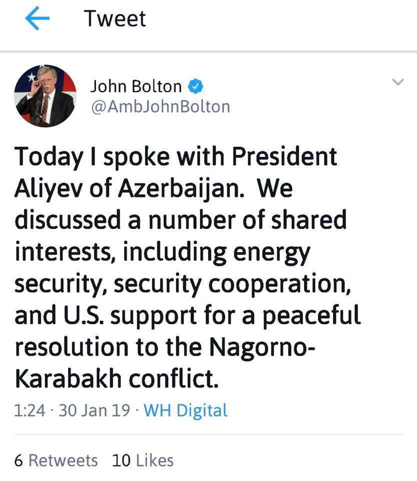 Հիշում եք, չէ՞, որ Բոլթոնը զանգել էր Նիկոլին, ու Նիկոլն առաջին բաներից մեկը, որ շտապեց մեզ տեղեկացնել, էն էր, որ «Արցախից չենք խոսացել»: Ու նենց շտապողականությամբ էր դրա մասին գրել, ոնց որ ինքը դրանից շատ ուրախ էր: Հիմա էսօր Բոլթոնը զանգել ա Ալիևին ու հատուկ շեշտել ա, որ խոսել են Արցախից: Հիմա կարա՞նք սրանից ենթադրենք, որ Բոլթոնը Նիկոլի հետ էլ ա խոսել Արցախից, ուղղակի վերջինիս խնդրանքով չէր հրապարակել, որ լրագրողները չհարցնեին, թե ինչ են խոսել, թե՞, այնուամենայնիվ, Բոլթոնը Նիկոլի հետ Արցախի հարցով «քննարկելու բան չունի», իսկ այ կիրթ Ալիևի հետ, ոնց տեսնում եք, ունի: