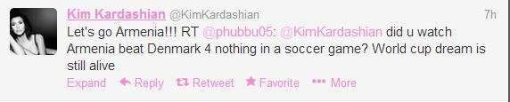Նման գրառում է կատարել Քիմ Քարդաշյանը` twitter-ի իր էջում` ոգևորված Դանիա – Հայաստան ֆուտբոլային հանդիպման արդյունքով, որը, հիշեցնենք, ավարտվել է մեր ընտրանու փայլուն հաղթանակով: