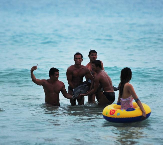 Ակնթարթորեն բազմություն է հավաքվել եւ փոխարենը օգնեն ծովափի ծանծաղ ջրերի թակարդի մեջ ընկած անօգնական դելֆինին, գրկել են եւ սկսել լուսանկարվել: