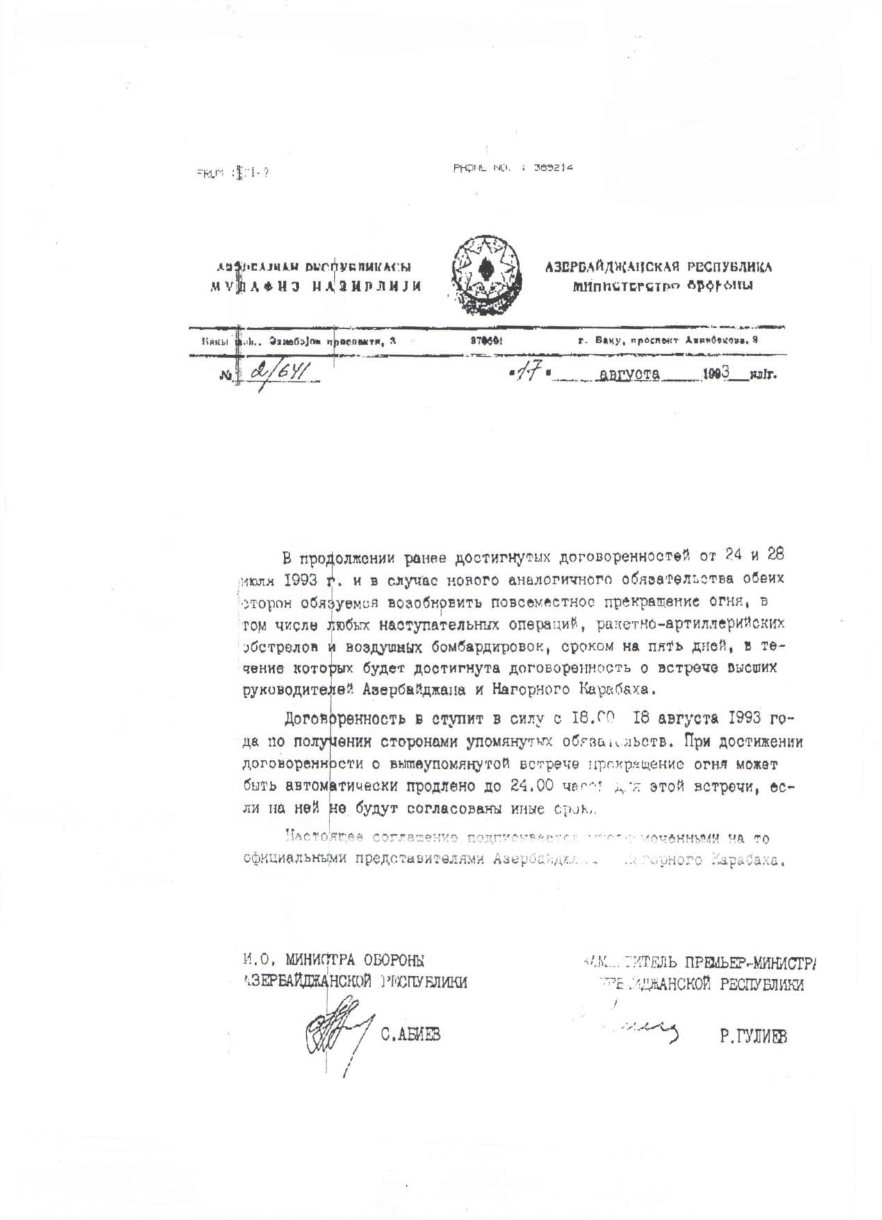 1994 թ․ օգոստոսի 29-ին Արցախը, Ադրբեջանը և Հայաստանը հանդես են եկել պաշտոնական հայտարարություններով, որոնցում հրապարակայնորեն հաստատել են կրակի դադարեցման մասին համաձայնագրերը պահպանելու իրենց պարտավորությունները։