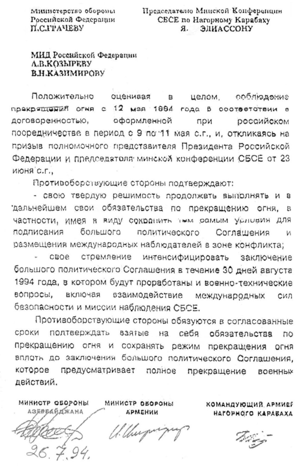 1994 թ․ օգոստոսի 31-ին Ռուսաստանի Դաշնության ԱԳՆ-ն հանդես է եկել հայտարարությամբ, որում նշված էր․ «Մոսկվայում ողջունում են այս օրերին Բաքվում, Երևանում և Ստեփանակերտում արված հատուկ հայտարարությունները, որոնցում գոհունակություն է հայտնվում առ այն, որ հակամարտության բոլոր կողմերը պահպանում են Լեռնային Ղարաբաղի շուրջ և հայ-ադրբեջանական սահմանին մայիսի 12-ից ՌԴ միջնորդությամբ հաստատված հրադադարը։ Ադրբեջանի, Հայաստանի և Լեռնային Ղարաբաղի ռազմական գերատեսչությունների ղեկավարների կողմից հրադադարի մասին հրամանների վերահաստատումը, հնարավոր խախտումների մեջ մեղավոր անձանց նկատմամբ պատժամիջոցների մասին հայտարարելը, հրադադարի ռեժիմը պահպանելու ընդգծված վճռականությունը՝ ընդհուպ մինչև զինված հակամարտության դադարեցման մասին քաղաքական համաձայնագրի կնքումը, մեծացնում են վստահությունն այն բանի հանդեպ, որ չնայած բոլոր դժվարություններին՝ Ղարաբաղում խաղաղ կարգավորման գործընթացը կարելի է անշրջելի դարձնել»։