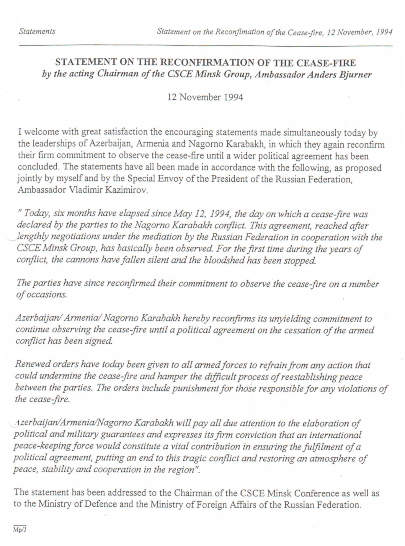 1994 թ․ նոյեմբերի 12-ին՝ հրադադարի ռեժիմը պահպանելուց 6 ամիս անց, Մինսկի խմբի գործող նախագահ Անդրես Բյուրները հանդես է եկել հայտարարությամբ, որում, մասնավորապես, նշված է. «գոհունակությամբ ողջունել եմ այսօր Ադրբեջանի, Հայաստանի և Լեռնային Ղարաբաղի առաջնորդների կողմից հրապարակված հուսադրող հայտարարությունները, որոնցում նրանք կրկին վերահաստատում են հրադադարը պահպանելու իրենց աներկբա պարտավորությունները՝ ընդհուպ մինչև ավելի լայն քաղաքական համաձայնագրի ստորագրումը»։ Անհրաժեշտ է նաև նշել, որ հայտարարության տեքստը կողմերին էին առաջարկել Անդրես Բյուրները և ՌԴ նախագահի լիազոր ներկայացուցիչ դեսպան Վլադիմիր Կազիմիրովը։