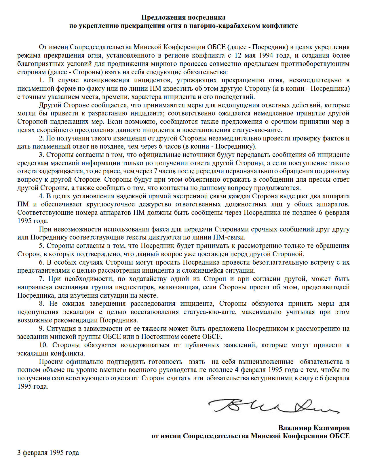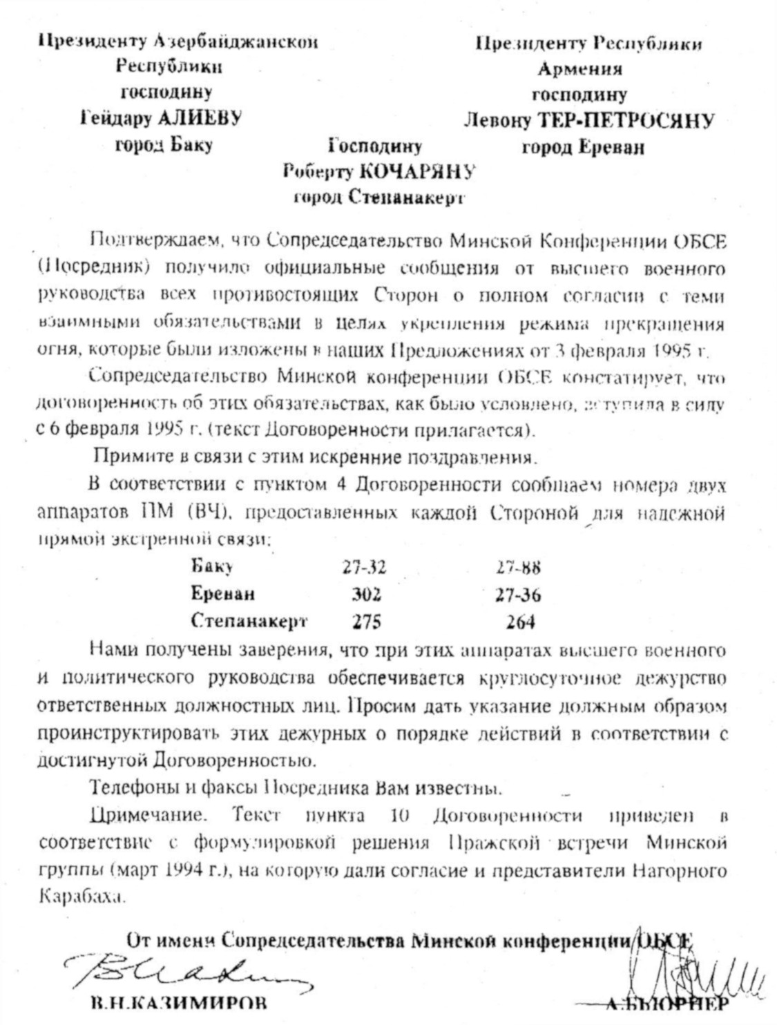 1995 թ․ փետրվարի 3-ին Մինսկի խմբի համանախագահությունը հրադադարի ռեժիմի ամրապնդման առաջարկով դիմել է Հայաստանի, Ադրբեջանի և Արցախի ղեկավարությանը։ Բոլոր երեք կողմերի համաձայնությունը ստանալուց հետո միջնորդներն Ադրբեջանին, Հայաստանին և Արցախին ծանուցում են ուղարկել համաձայնագրի ուժի մեջ մտնելու մասին, ինչպես նաև ուղիղ անհետաձգելի կապ հաստատելու համար նշել են Բաքվում, Երևանում և Ստեփանակերտում գործող կառավարական միջքաղաքային կապի հեռախոսահամարները։