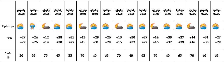Երևան քաղաքում՝ մայիսի 28-ին՝ կեսօրից հետո, քաղաքի առանձին հատվածներում հնարավոր է կարճատև անձրև և ամպրոպ։ Մայիսի 29-31-ը, հունիսի 1-2-ը սպասվում է առանց տեղումների եղանակ։