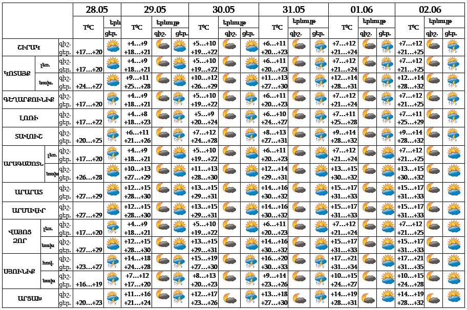 Հանրապետության տարածքում` մայիսի 28-ին, 29-31-ը, հունիսի 1-2-ը՝ կեսօրից հետո, առանձին շրջաններում սպասվում են կարճատև անձրև և ամպրոպ, առանձին հատվածներում հնարավոր է կարկուտ: