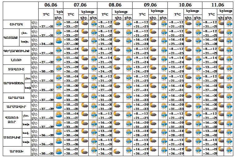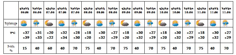 Երևան քաղաքում՝ հունիսի 6-ի երեկոյան ժամերին քաղաքի առանձին հատվածներում հնարավոր է, 7-ից 11-ի երեկոյան ժամերին սպասվում է կարճատև անձրև և ամպրոպ, ամպրոպի ժամանակ նաև քամու ուժգնացում մինչև 15-20 մ/վ արագությամբ: