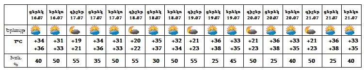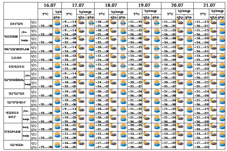 Հանրապետության տարածքում հուլիսի 16-ի ցերեկը, 20-21-ը սպասվում է առանց տեղումների եղանակ, 17-19-ը հյուսիսային առանձին վայրերում սպասվում է կարճատև անձրև և ամպրոպ, առանձին վայրերում հնարավոր է նաև կարկուտ: