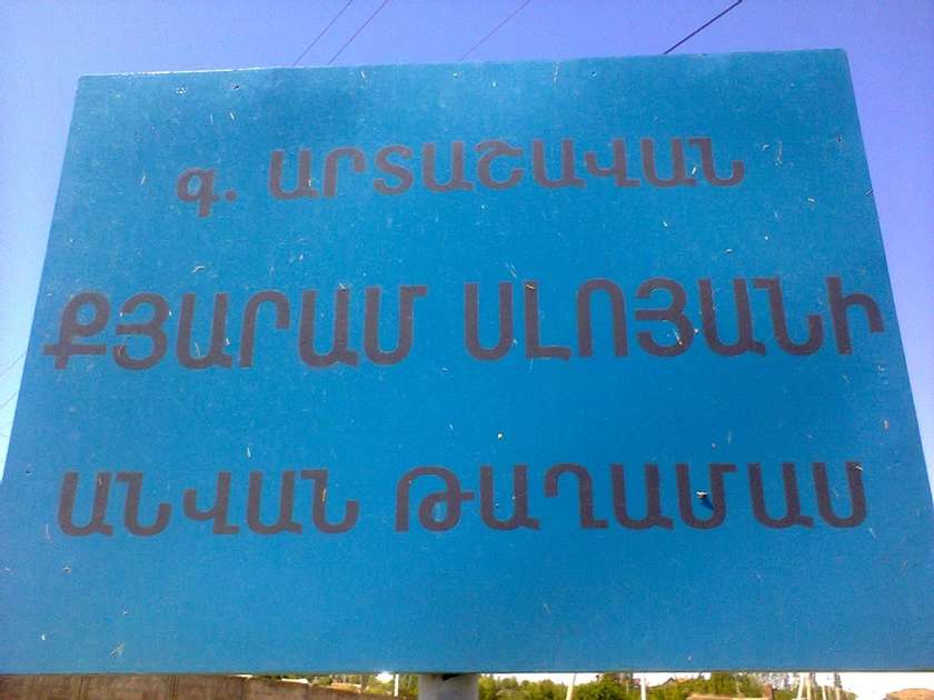 Նաև ցուցանակը մեծացնել, ու երևի թե սպիտակով կամ դեղինով գրելն է ճիշտ որ երևա կապույտի վրա: Ինչու՞ չէ , նաև նկարը թող լինի խորհրդանշող: